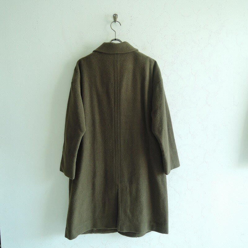 表記サイズ:FREE 実寸サイズ:肩幅55.5cm, 身幅55cm, 袖丈47cm, 着丈91cm, ウエスト幅56cm, ヒップ幅56cm, スリット後裾25cm (多少の誤差はご了承ください) 素材:表地-毛88%,ナイロン12% 身頃裏-綿100% 袖裏-キュプラ100% デザイン:I-UKI-KAHA-NGURENGUREの縮絨起毛オーバーコートです。