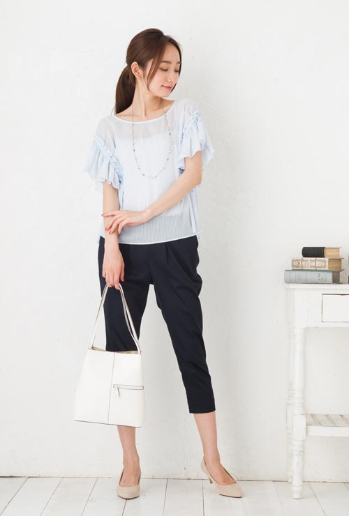 シアーな揺れ感を堪能 カチオンドビーストライプ袖ドロストフリル遣いブラウス シアーな生地にのせたストライプ柄が清涼感満点の、ブラウスです。